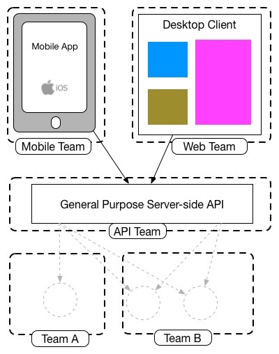 你可以看到这里我们遇到的问题:不必要的沟通成本和互相等待;后端团队开始对单体应用产生了问题,因为增加新的功能变得更加困难,同时救火的问题也变得更加突出。换句话说,微服务对于一个十几个不同的团队、上百人的开发而言绝对是一件收益更大的事情,但是在这个过程中,我们后端服务引入了BFF的概念。