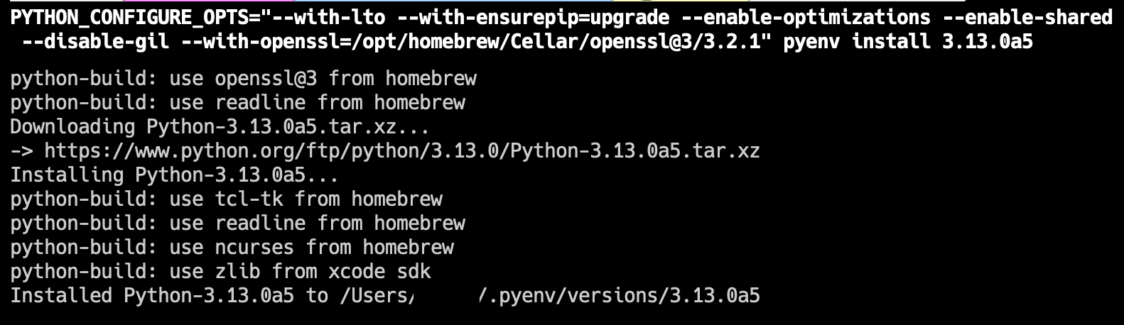 在这篇文章中,我们将会使用 Python 3.13a5 来演示如何禁用 GIL。你可以在这里下载 Python 3.13a5 的安装包。当然你也可以通过 pyenv 管理多版本的 Python 版本。下图就是演示如何使用 pyenv 安装 Python 3.13a5 的过程: