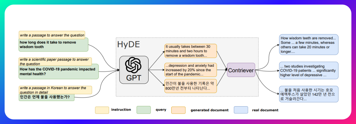 HyDE 的核心思想是,通过对比真实文档和"假设"文档的差异,学习出能够更好捕捉文本语义和上下文信息的文档向量表示。所谓"假设"文档,是指通过 mask、重排等方式人为构造的虚拟文档。模型需要学会区分真实文档和这些假设文档,从而得到蕴含深层语义的文档向量。