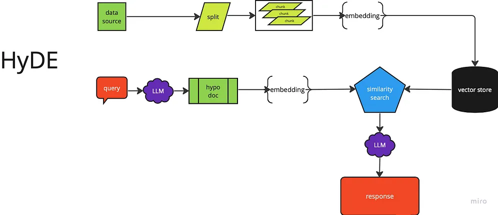HyDE (Hypothetical Document Embeddings) 是一种基于 RAG 模型的模式,它使用 LLM 生成一个假设的回答文档,然后将这个假设的回答文档与知识库中的文档进行比较,从而找到与用户问题相关的信息。