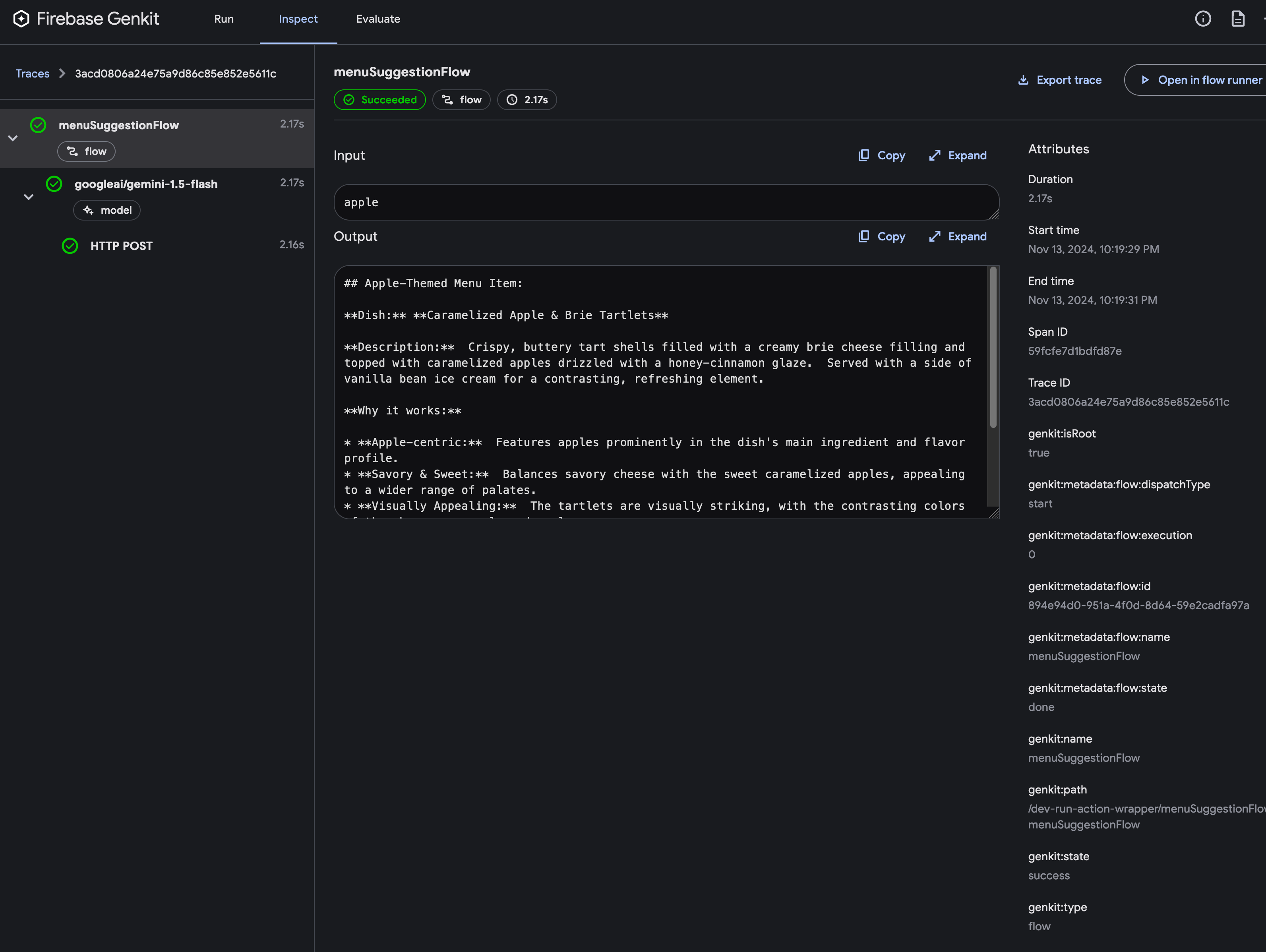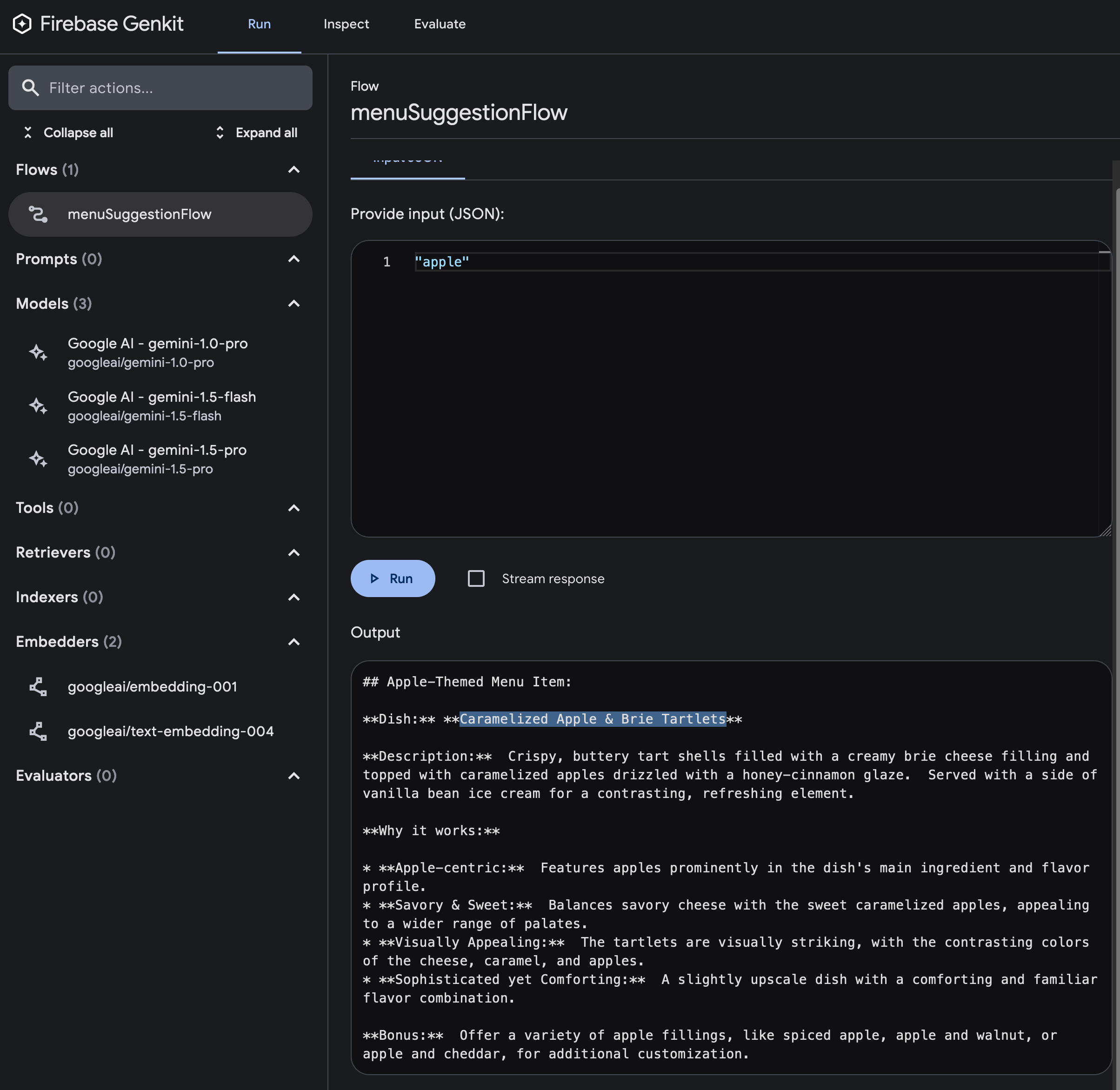 这个默认的项目模版中定义了一个默认的 flow,名叫 menuSuggestionFlow。我们可以选择这个 flow 来,来进行测试。比如如下图所示,我们输入 apple,让 AI 帮我推荐一个菜品: