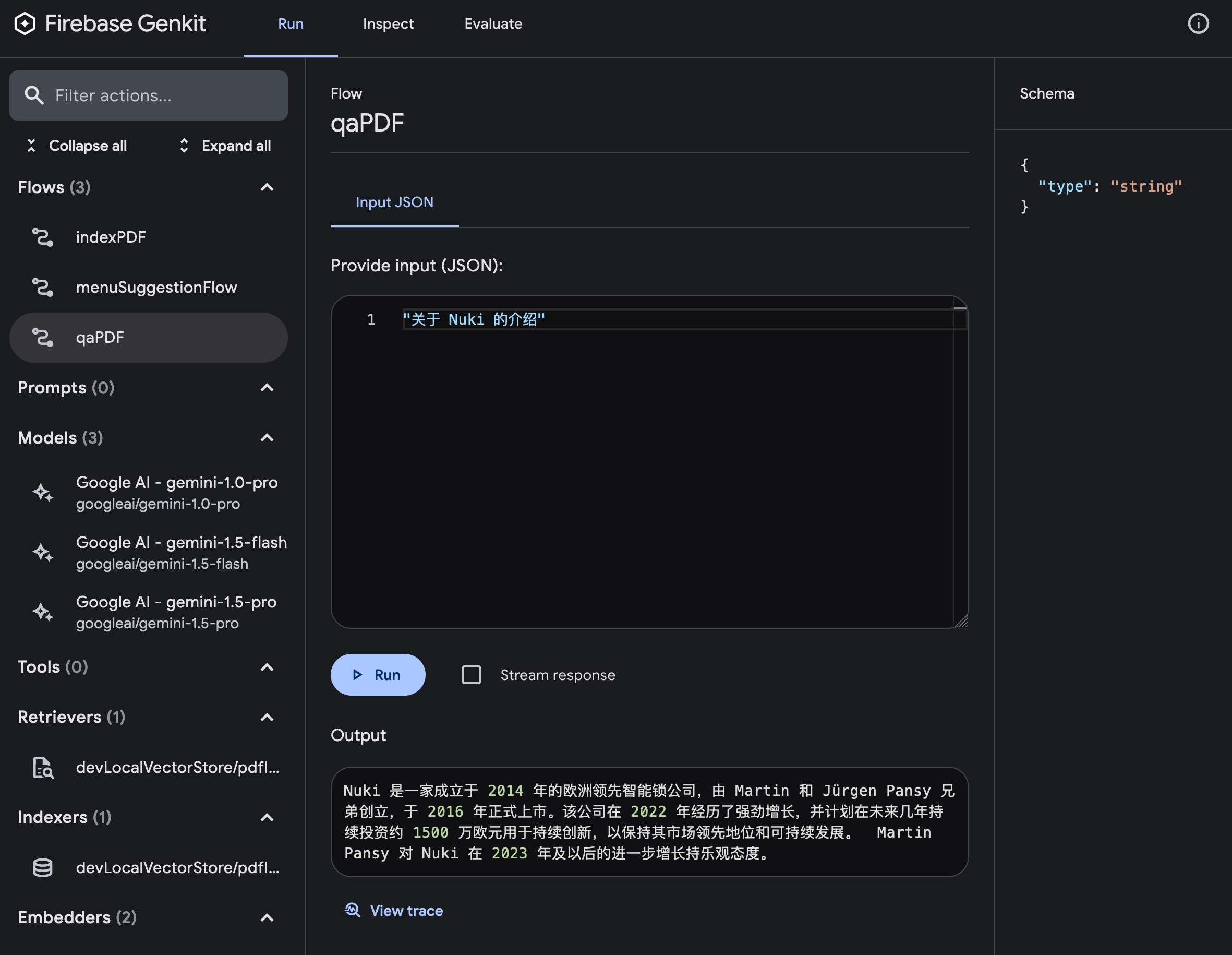 现在我们已经定义了一个完整的工具流程,刚刚的工作流用于处理文件内容,这个工作流用于检索这些相关信息并进行回答。因为我使用的文件是 Nuki 公司的介绍文件,那么我的问题自然也和这家公司相关: