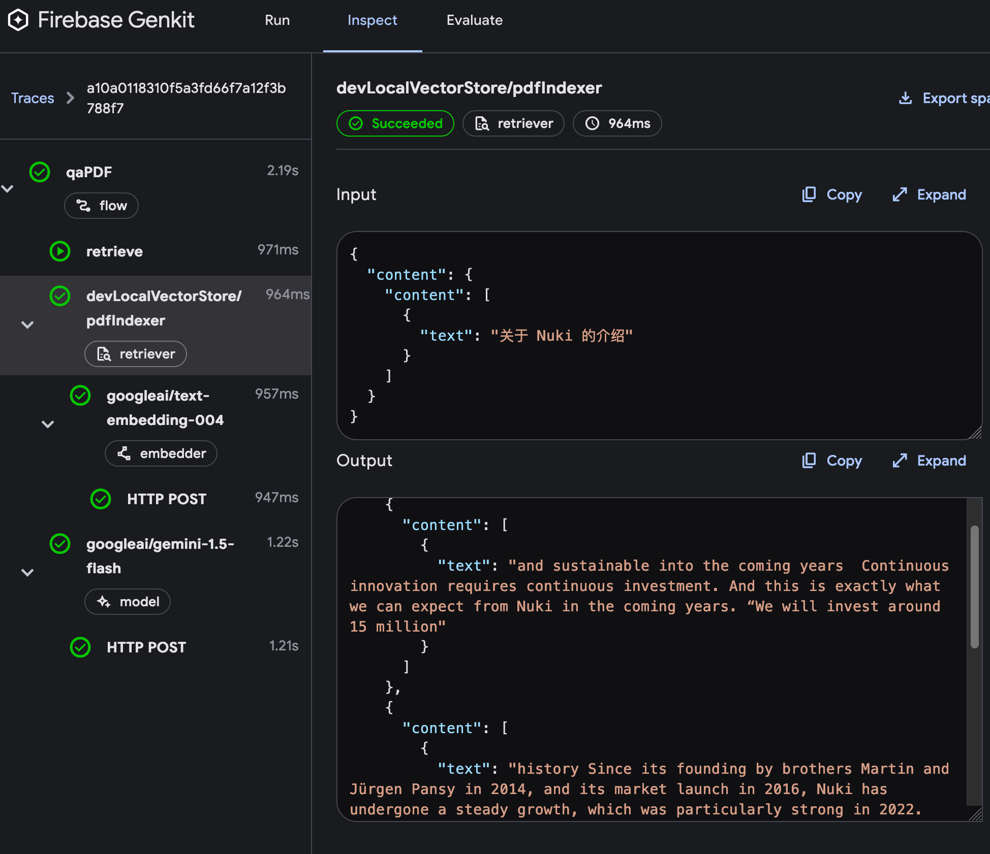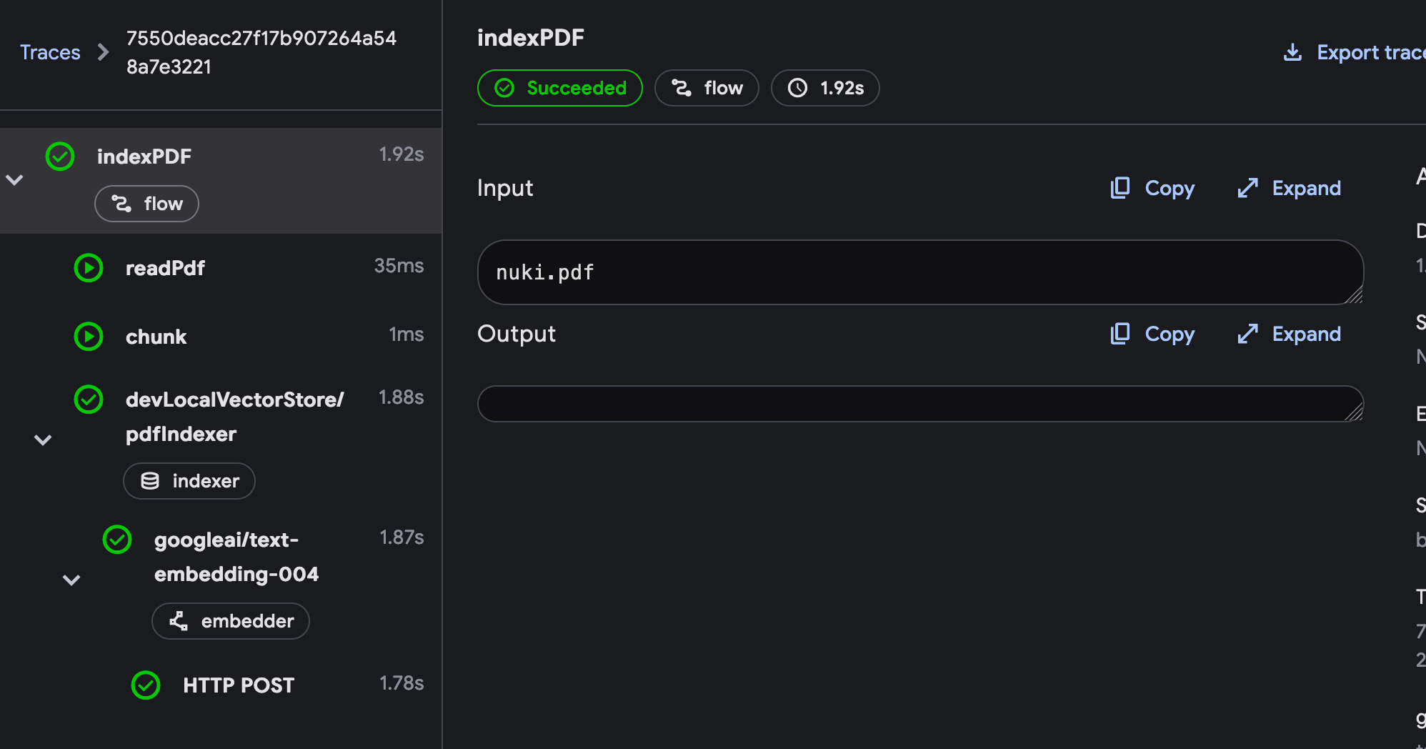 如果这个时候你还在运行 Genkit 的开发服务器,那么它会自动尝试构建这段代码,这时候我们回到 Genkit 的 UI 界面,选择我们刚刚定义的 indexPDF 工作流,然后输入一个 PDF 文件路径,点击 Run 按钮,就可以看到这个工作流的执行结果。注意上面的代码中,genkit.Run 方法的第一个参数是 ctx,这个参数是 Genkit 提供的上下文,可以用于追踪和日志记录。为了方便检查,我们也可以通过 View Trace 查看一下我们当前的执行调用情况: