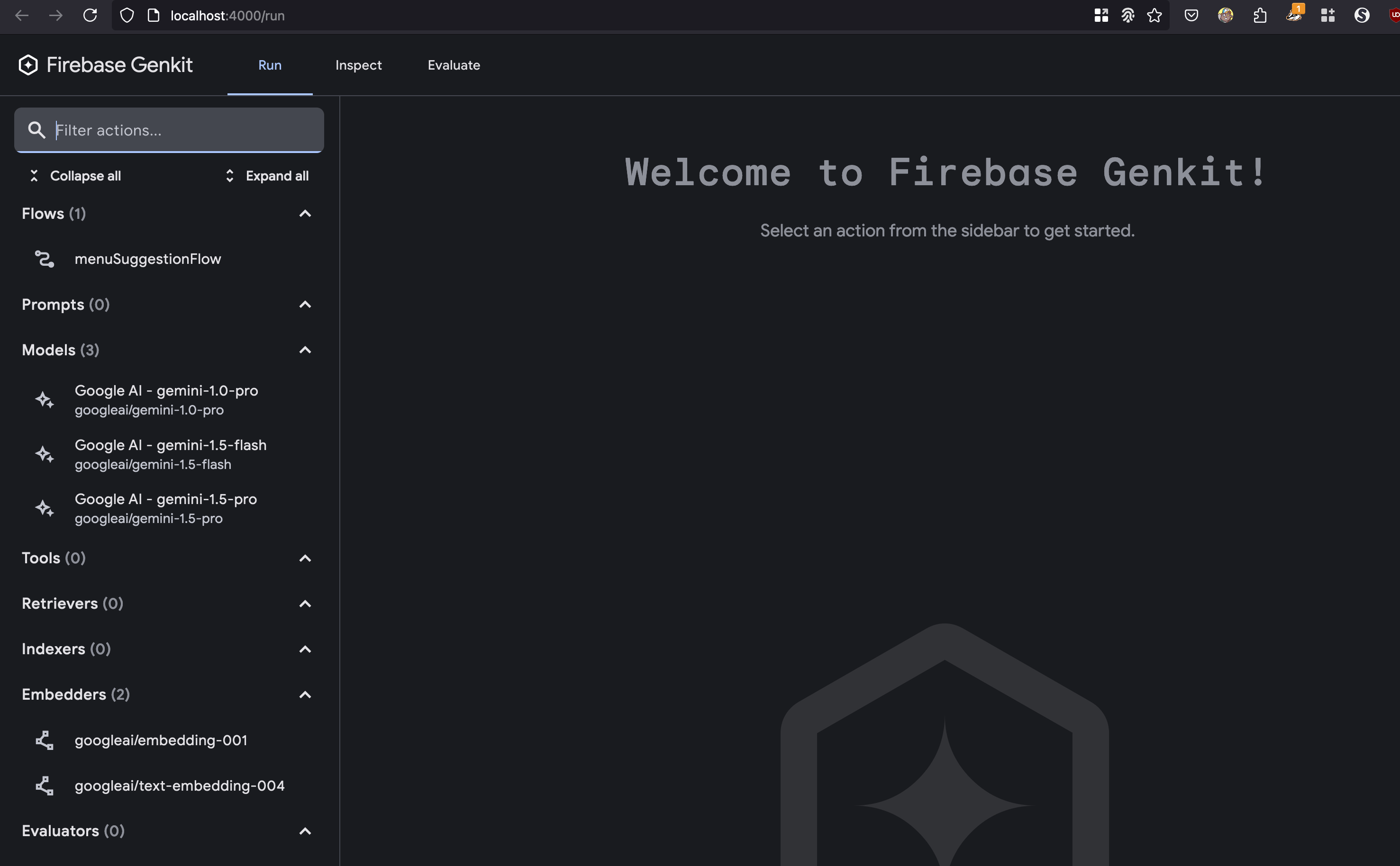 通过上面的输出,我们可以看到 Genkit 的开发服务器已经启动,并且我们可以通过 http://localhost:4000 访问 Genkit 的 UI 界面。这是 Genkit 提供的工具界面,通过这个界面,我们可以方便的调试和测试我们的 AI Agent。